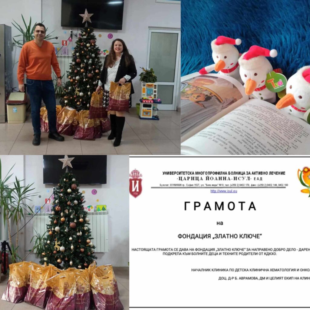 Часове преди настъпване на Новата година фондация “Златно ключе” – Малък куклен театър Слон посети Специализирана болница за активно лечение по детски болести проф. Иван Митев. По традиция бяха поднесени подаръци с пожелание за здраве и много радост на децата и техните семейства.