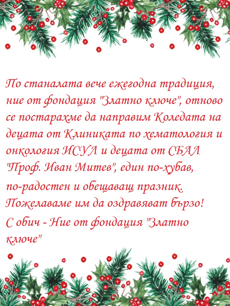 Както всяка година фондация "Златно ключе" - Малък куклен театър Слон посетиха детско онкологично отделение в ИСУЛ и занесоха подаръци за децата и лекарите с пожелание към тях и всички близки и приятели за много здраве и щастие.В отговор децата ни подариха най-хубавите картички. Благодарим!
